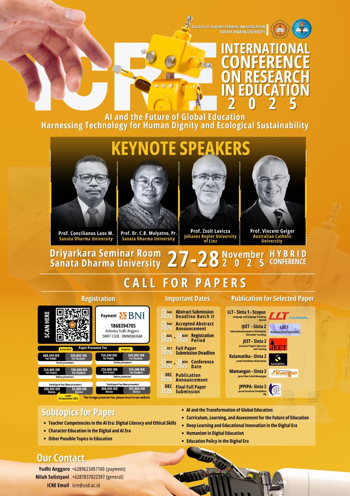 International Conference on Research in Education (ICRE) 2025 adopts the theme "AI and the Future of Global Education: Harnessing Technology for Human Dignity and Ecological Sustainability" This conference is conceived as an interdisciplinary scholarly forum that fosters rigorous academic inquiry into the integration of technological innovation, reflective pedagogy, and humanistic values within global education systems. By convening academics, practitioners, and policymakers from diverse national and disciplinary backgrounds, ICRE 2025 seeks to formulate educational strategies that are not only responsive to the dynamics of contemporary change but also fundamentally grounded in the principles of human dignity and ecological sustainability.