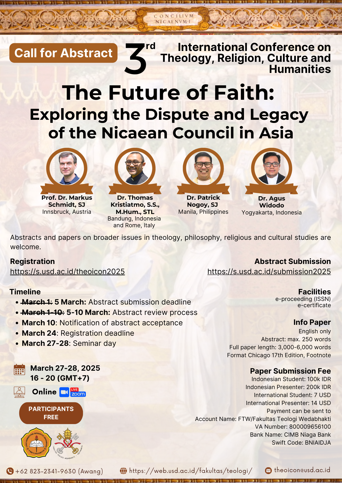 The TheoIcon 2025 aims to examine the historical impact and contemporaryrelevance of the First Council of Nicea (325 CE) in Asian Christian contexts, interfaithdialogues, and theological developments. Two fundamental questions that arechallenging to be explored are: First, what was the dispute and historical legacy of theNicean Council? Second, which relevance would this council have especially whenChristian faith is faced with Asian challenges such as secularism, scientificdevelopment, intercultural and interreligious encounter and social problems?