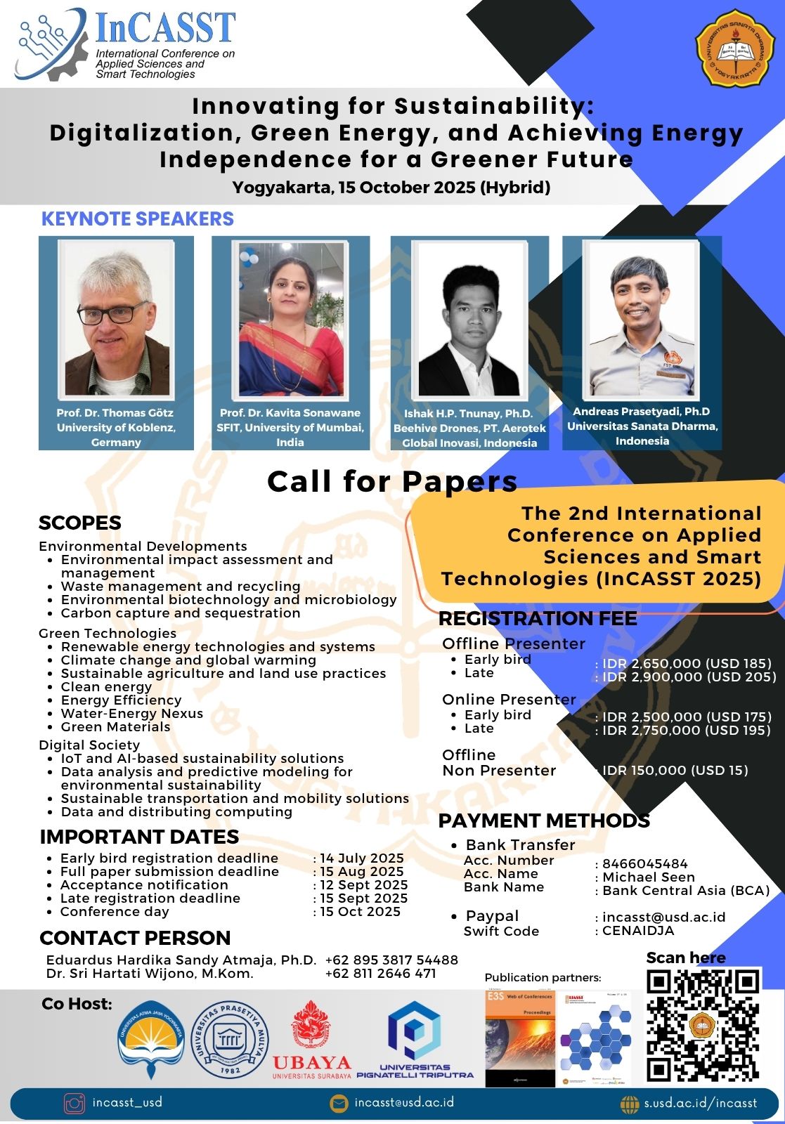 2nd InCASST 2025 (International Conference on Applied Sciences and Smart Technologies) will be held on October 15th, 2025 in Yogyakarta, Indonesia on hybrid mode. The theme of this conference is "Innovating for Sustainability: Digitalization, Green Energy, and Achieving Energy Independence for a Greener Future". We would like to invite researchers and practitioners in the fields of applied Mathematics, Electrical Engineering, Informatics, and Mechanical Engineering.