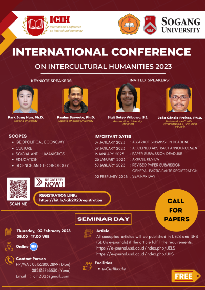 The International Conference on Intercultural Humanities aims to deepen collaboration between Sanata Dharma University and Sogang University, Korea, as members of the Association of Jesuit Universities and Colleges in Asia-Pacific (AJCU-AP). Participants and presenters of this conference are master and doctoral program students from various universities in different countries. The conference fosters enthusiasm for students to attend the conference.